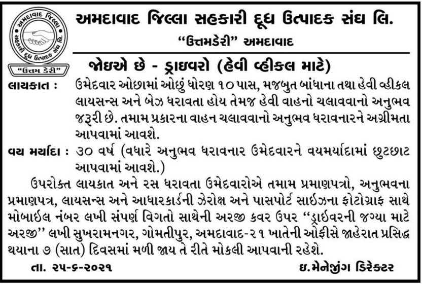 Ahmedabad District Co - operative Milk Producers Union Limited (Uttam Dairy Ahmedabad) Recruitment for Driver (heavy vehicle) Post 2021. You can find other details like age limit, educational qualification, selection process, application fee, and how to apply are given below. Keep checking Ojas Adda regularly to get the latest updates.